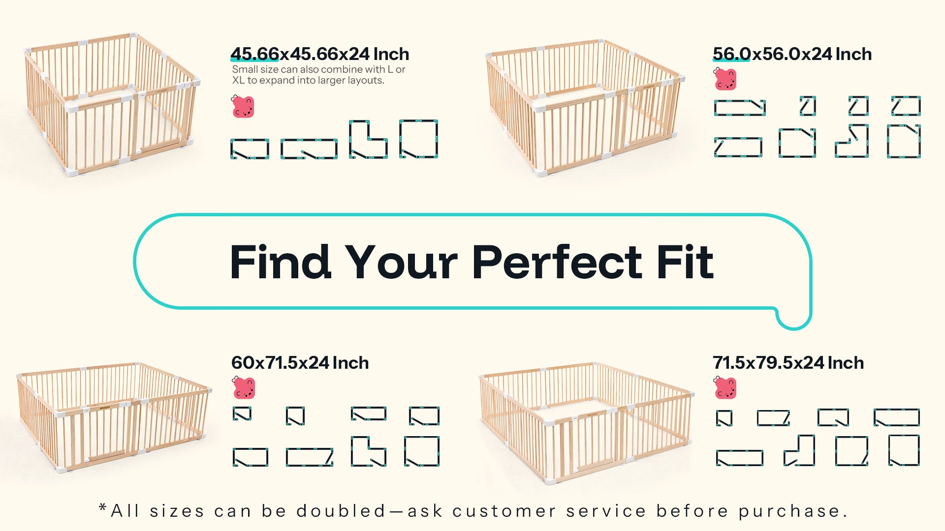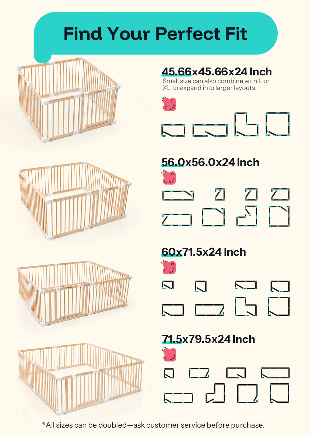Yes! The playpen is modular and fully customizable. It comes in four preset sizes—from about 45″×45″ to 71.5″×79.5″—but you can remove panels to fit smaller spaces or connect two sets together for a larger layout.