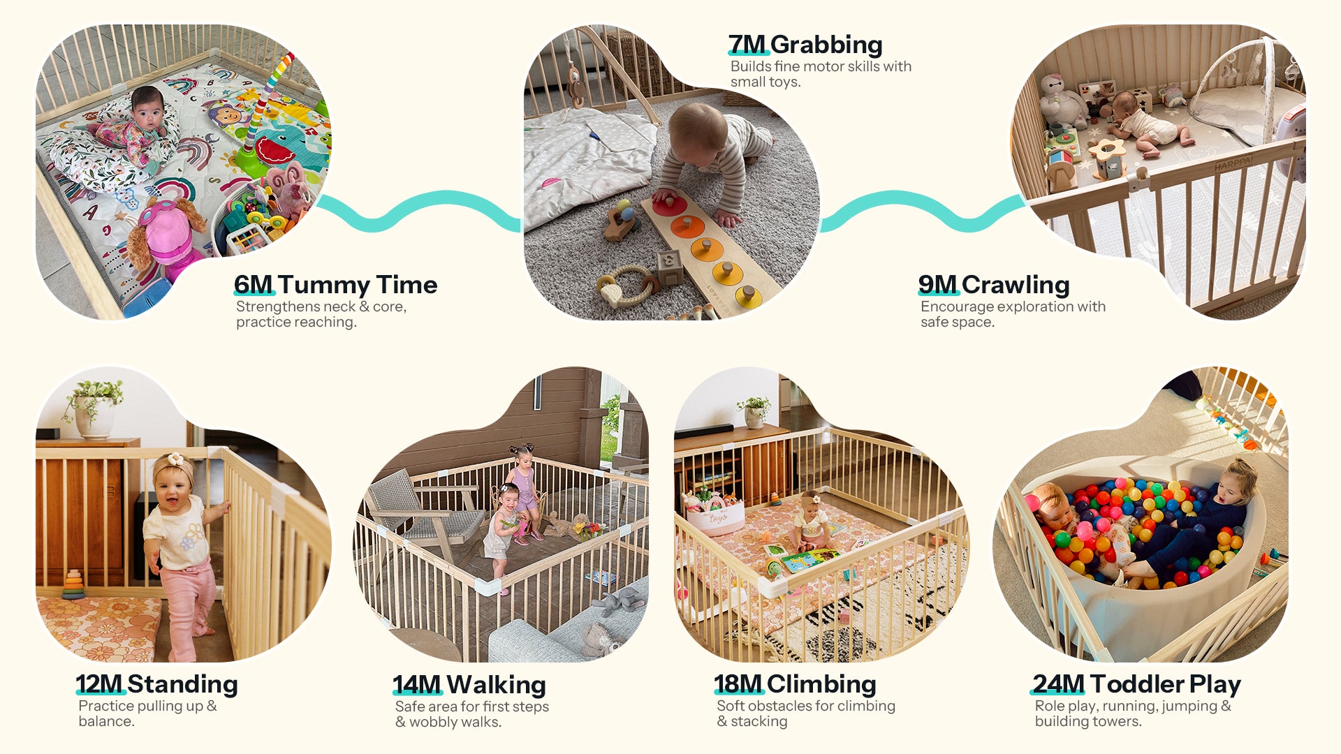 【Montessori-inspired Educational Play Area】Grovi’s Montessori-inspired playpen design encourages your baby’s natural curiosity and creativity. As a wooden play yard with a baby-safe natural finish, it supports learning and engagement while remaining free from chemicals, varnish, or excess glue. It's more than a playpen for babies — it's a nurturing space for growth.