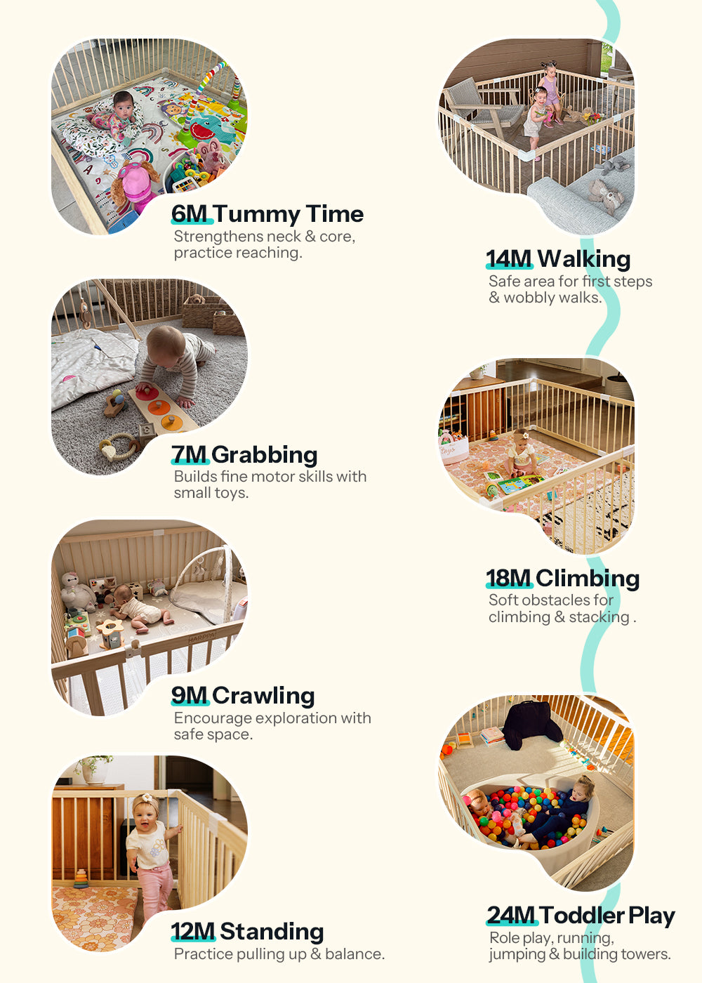 Natural and non-toxic, safe even when your baby chews, with no chemicals and nothing that flakes. Strong and steady so it won’t wobble like plastic. The wood blends into your home instead of looking like a toy. Keeps your little one safe while you cook, shower, do laundry, or take a short break. And it creates a Yes Space where your baby can explore, wobble, giggle, and learn at their own pace.