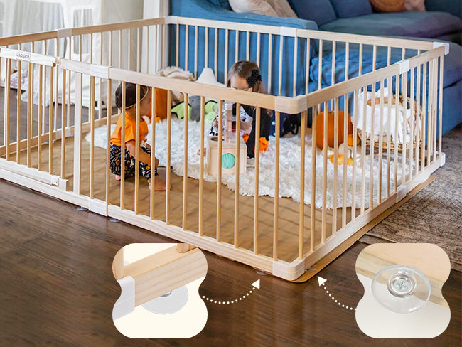 The playpen uses suction cups for smooth floors and secure connectors for strong structure.