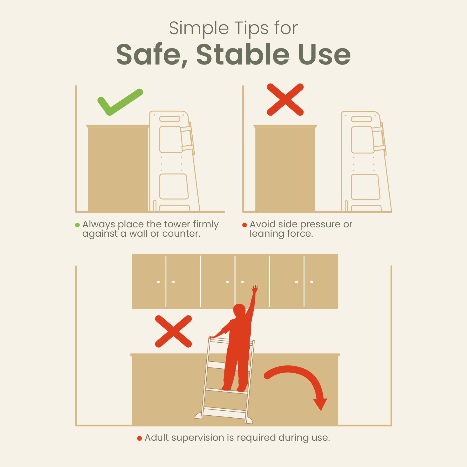 - Place the tower flat against the counter so your child faces the work surface and doesn’t lean backward.