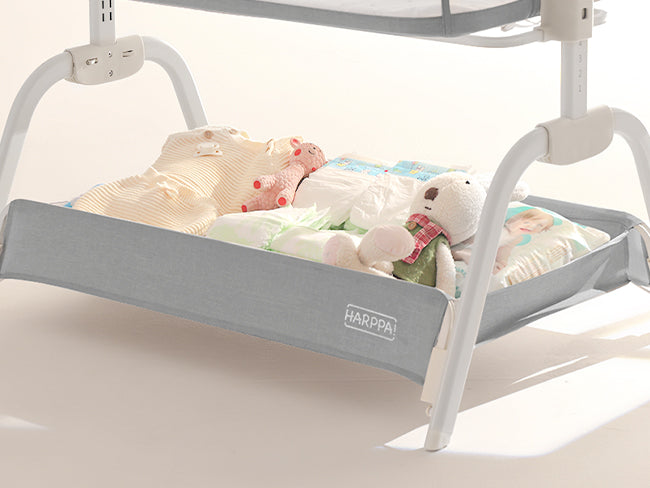 Keep diapers, wipes, pacifiers, and baby must-haves right under the bassinet. Because no one wants to go hunting for a burp cloth at 2 a.m.