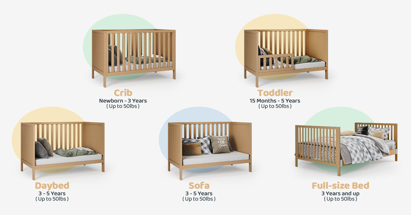 With the right accessories, it converts from crib to toddler bed to daybed—so you can use it from newborn to big kid, typically up to 5 years old.