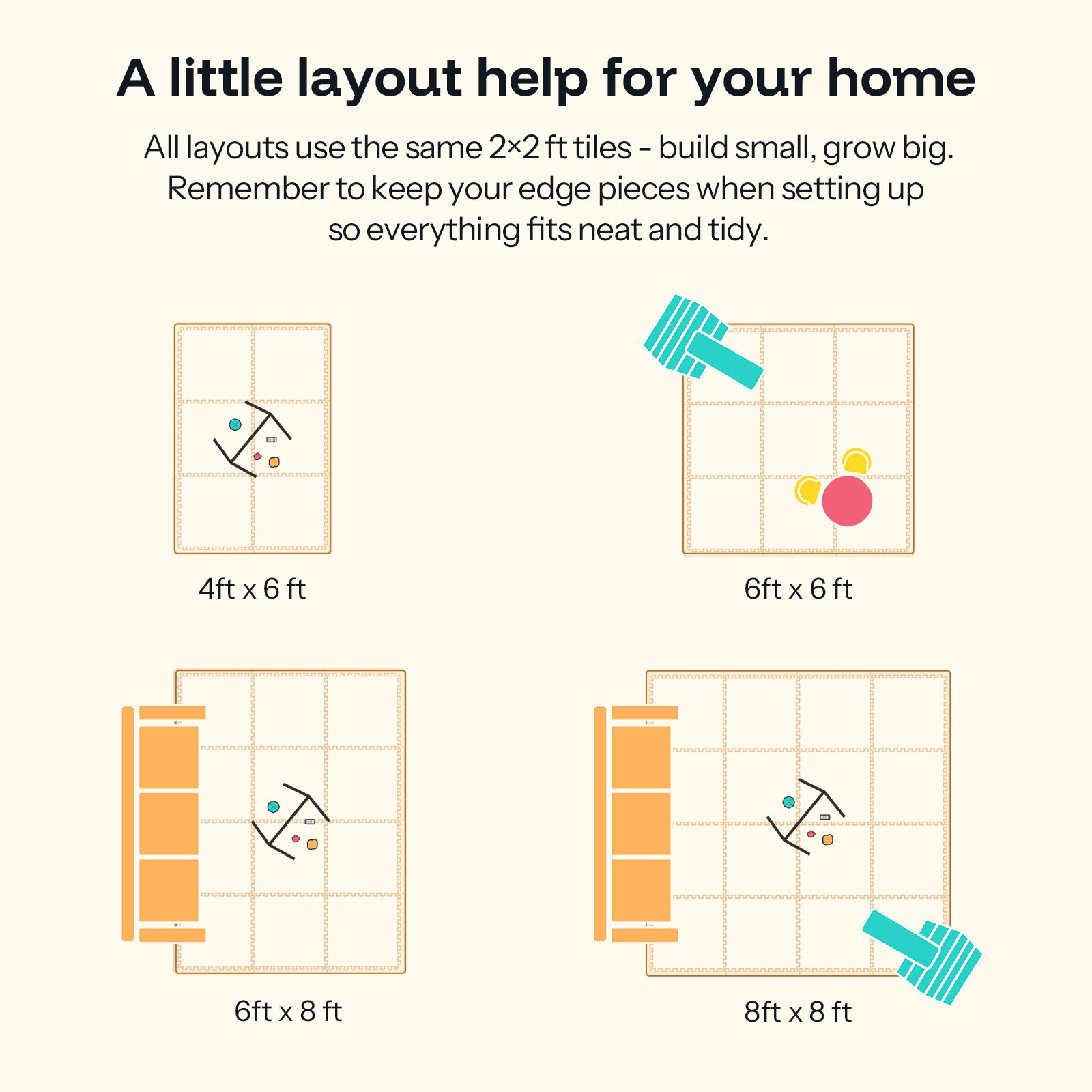 Each tile is 2' × 2'. Start small, expand anytime, and mix sets for a seamless look as your little one roams.