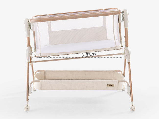 Yes. You can slightly tilt one side of the bassinet (3°–7°) to reduce reflux and spit-up after feeding. It’s a small but powerful feature that helps babies rest better — and helps parents worry less.