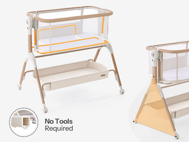 【Tool-Free Assembly & Convenient Storage】No tools, no stress. Just click the parts together and unfold in under five minutes. The spacious storage basket underneath holds up to 11 lbs of baby essentials, diapers, blankets, and all the little things you want close at hand. It’s the kind of smart detail that makes this easy-setup bedside bassinet a favorite for new parents.