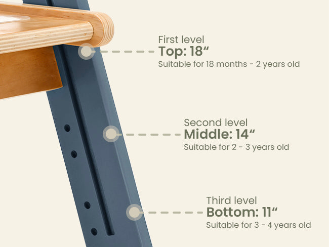 Designed for growth, our HARPPA Nordi kitchen learning helper tower adjusts to match your child's development from 18 to 48 months, with three adaptable heights: 11", 14", and 18".