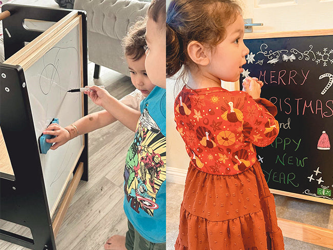 The Nordo Toddler Kitchen Tower feature a functional dual-sided chalkboard, which serves as a Montessori learning helper tower. Children can engage their creativity and develop their imagination by drawing and writing on the chalkboard or whiteboard. It provides a platform for them to explore coloring, play games, and express themselves through writing on this multi-functional message board.