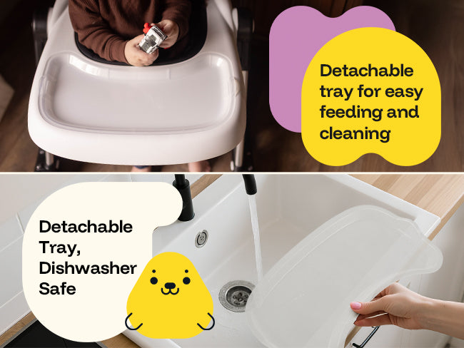 The clear snack and play tray is safe for direct food contact and removes quickly for easy dishwasher cleaning. Smooth, rounded surfaces reduce crumbs and keep cleanup simple — because life with a baby is joyful, a little messy, and always moving.