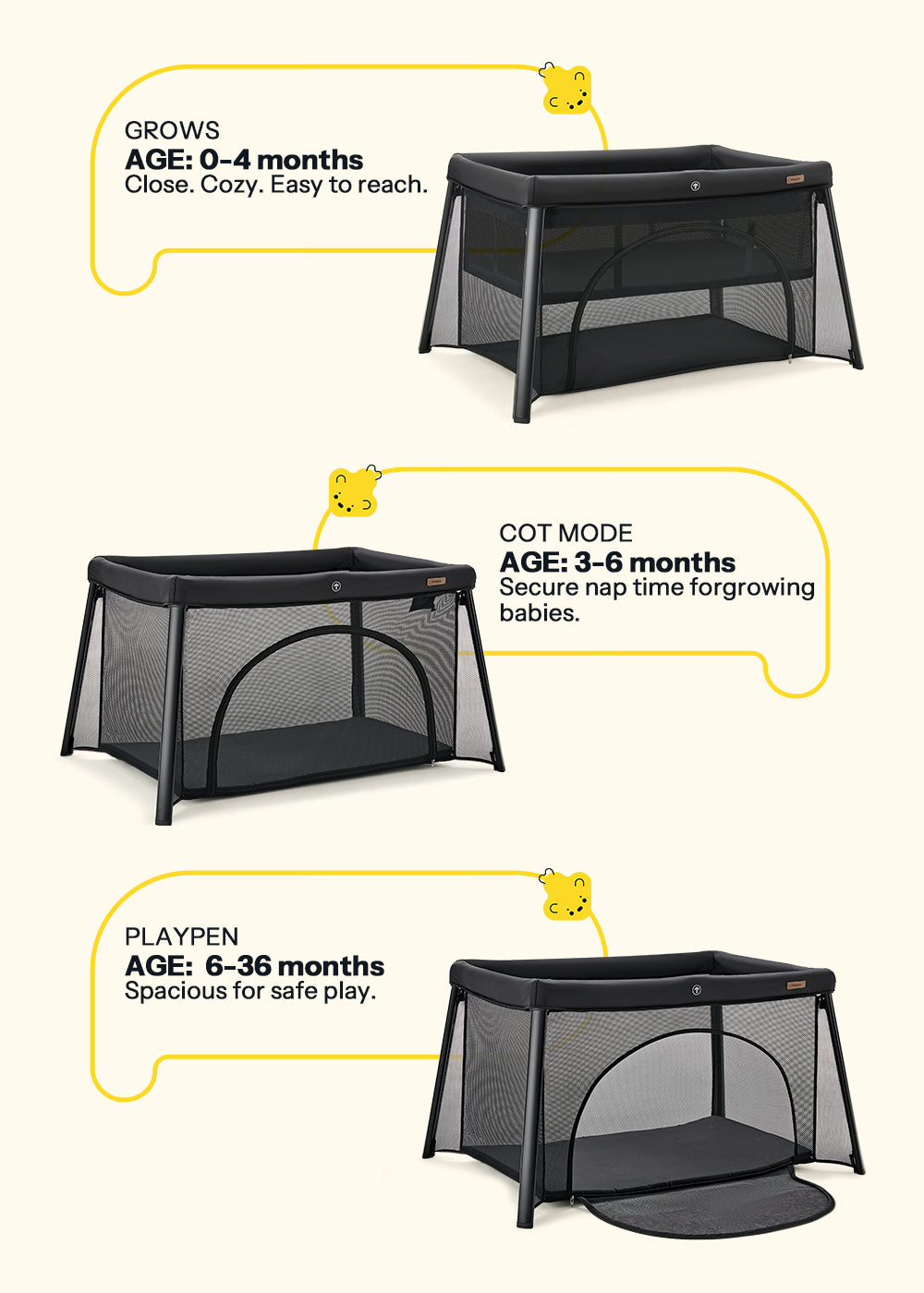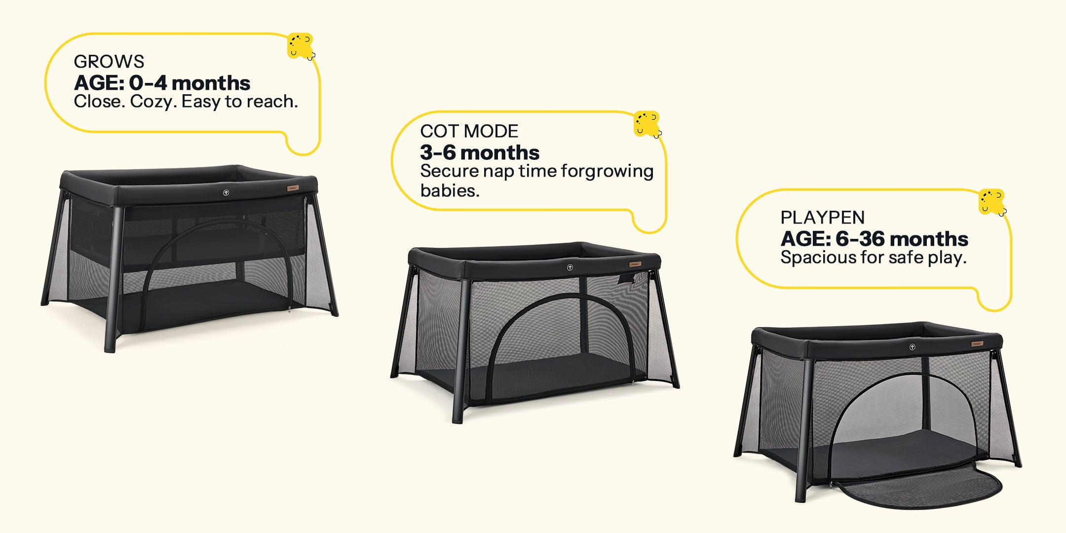 Bassinet, cot, and playpen in one—grows with your baby for years, not months.