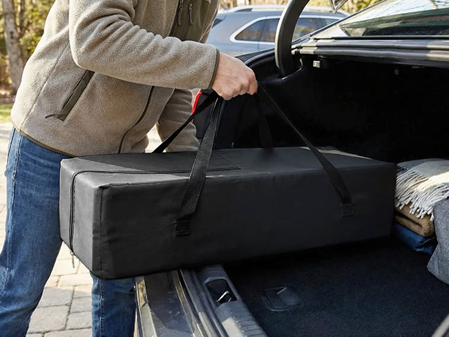 Rossi sets up in about 15 seconds — no tools required. Unfold, zip the mattress, and you’re done. When it’s time to go, it folds flat to a carry-on size and slides into the padded travel bag that’s included.